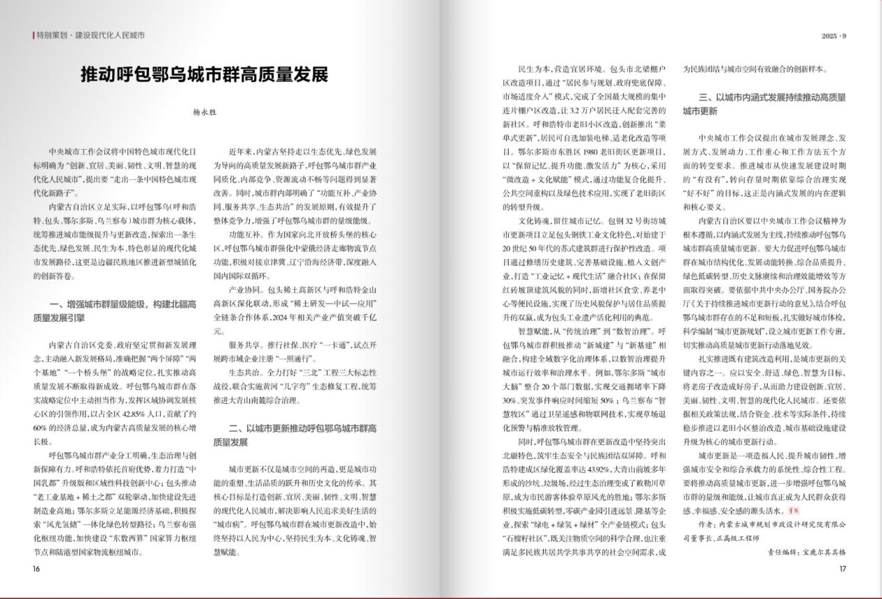 內(nèi)蒙古自治區(qū)以呼包鄂烏城市群為核心載體,通過(guò)城市更新推動(dòng)高質(zhì)量發(fā)展,探索出一條生態(tài)優(yōu)先、綠色發(fā)展、民生為本、特色彰顯的現(xiàn)代化城市發(fā)展路徑。文章從增強(qiáng)城市群量級(jí)能級(jí)、推動(dòng)城市更新實(shí)踐、促進(jìn)城市內(nèi)涵式發(fā)展三個(gè)方面,系統(tǒng)闡述了呼包鄂烏城市群在功能互補(bǔ)、產(chǎn)業(yè)協(xié)同、服務(wù)共享、生態(tài)共治等方面的創(chuàng)新舉措與成效,展現(xiàn)了其在提升城市綜合品質(zhì)、增強(qiáng)區(qū)域競(jìng)爭(zhēng)力、筑牢北疆生態(tài)與民族團(tuán)結(jié)屏障方面的實(shí)踐成效。